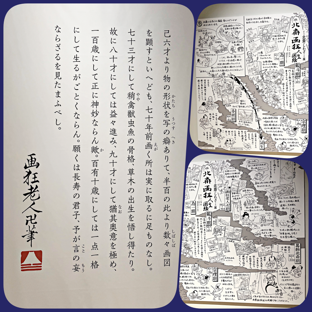 「6歳頃から絵を描き、50際の頃から様々な作品を発表したが、70歳より前に描いた絵は取るに足らない。73歳になって鳥や獣、虫や魚などの骨格や草木の生え方が分かってきた。80歳になればそうした摂理がもっとわかるようになり、90歳になってその奥義を見極めることができるようになるだろう。100歳になればそれを超越した世界を知ることができ、110歳では1点1画がまるで生きているように描くことができるだろう。長寿の神様、自分の言葉が嘘でないことを見ていて欲しい」