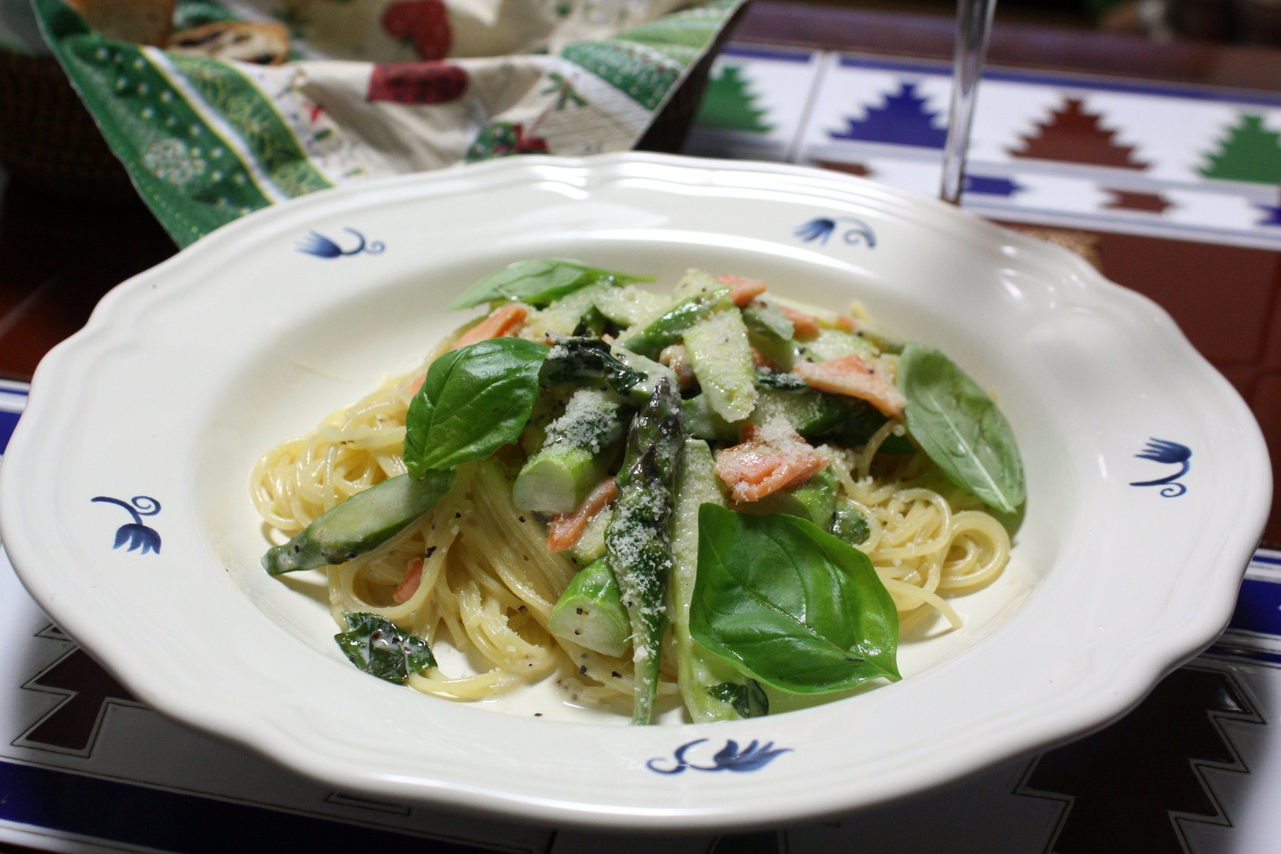 "アスパラとバジルのパスタ" にスモーク・サーモンを足しました。