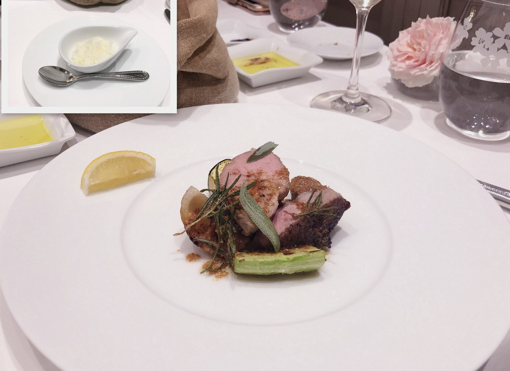 ワインは、初めグラスのリストを見てピエモンテのリースリングとアルザスのシャルドネで迷ったのですが、やっぱりボトルにしようということになり、ナイショ(!) でテイスティングさせていただいて、アルザスのシャルドネの方にしました。"Zind 2016, Zind-Humbrecht"