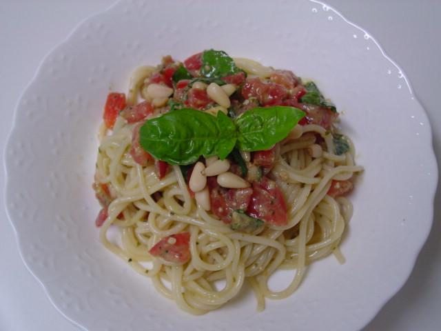そして、今夜のパスタは最近のMy Boom "ペスト・ジェノベーゼとトマトの冷製パスタ"