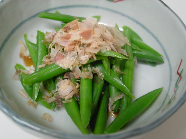 インゲン豆はゆでて、お醤油とかつをぶしけずりで。ちょっと固めが青っぽくて美味しい。