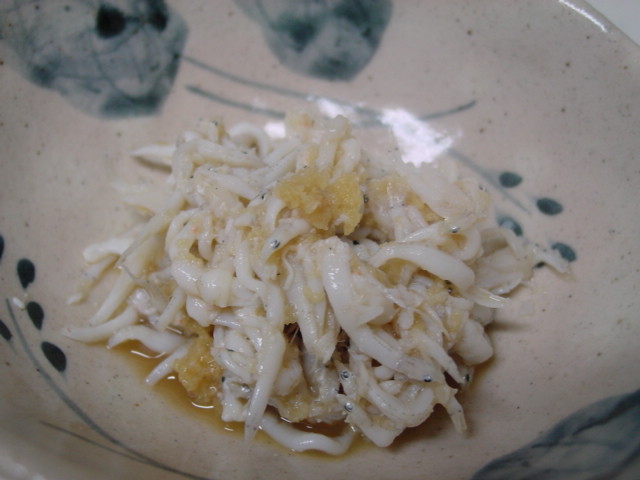 白魚は熱湯でさっと茹でて、氷水に入れ、水気を取って、生姜醤油で和えました。