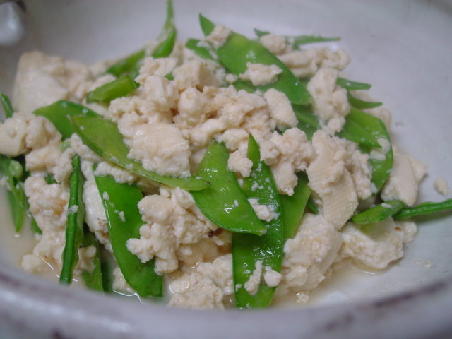 今日のお豆腐のお供は絹さやです。シャキシャキ感が好きで絹さやばっかり選んで先に食べてしまいます(笑)
