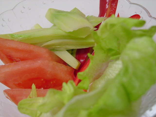 お箸休めはこれも生活クラブから届いた野菜揚げ。そして、相変わらずのサラダです。