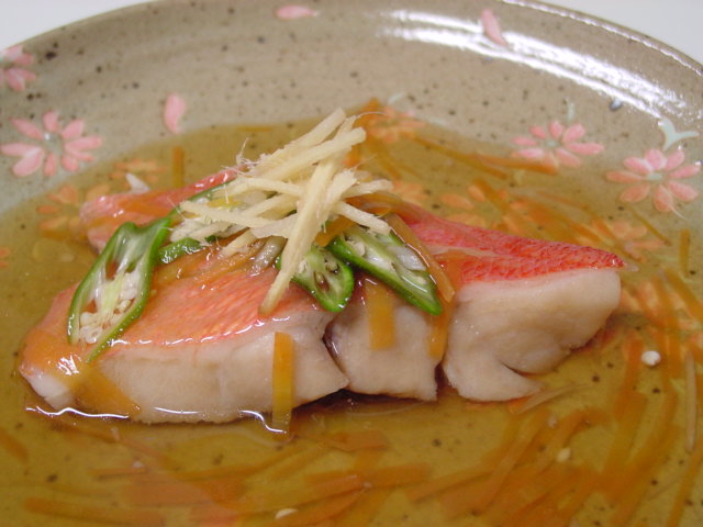 ↑ 前夜、食べられなかった金目の煮魚は、煮汁にとろみを付けて人参とオクラを入れてあんかけにしてみました。これなかなか美味しくて自画自賛(笑)