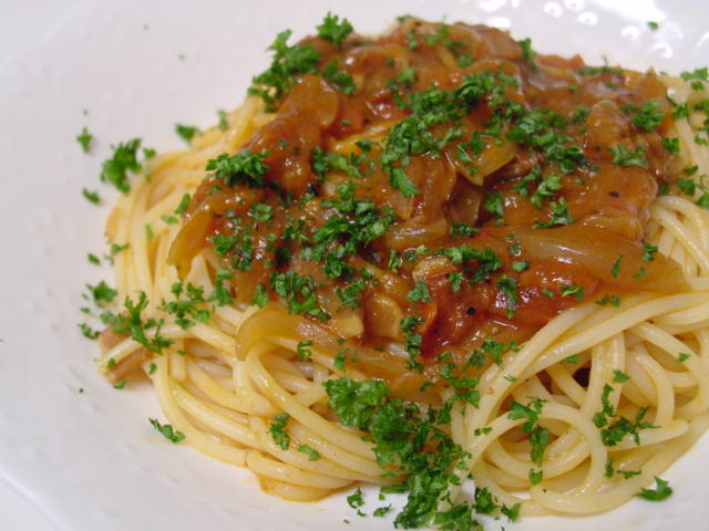 今夜のパスタは玉葱とベーコンのトマト・ソースですが、このソースのベースはカレーです。