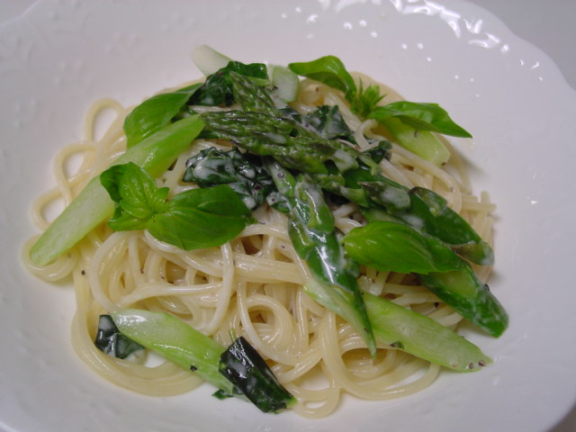 "アスパラとバジルのパスタ" 。
