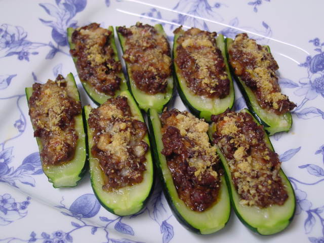 ラグー(ミート・ソース)に、くり抜いたズッキーニの炒めたものを混ぜて更に炒め、少し茹でたズッキーニの上に載せパルミジャーノ・レッジャーノをかけてオーヴンで15分くらい。 誰もが好きなメニューですね。