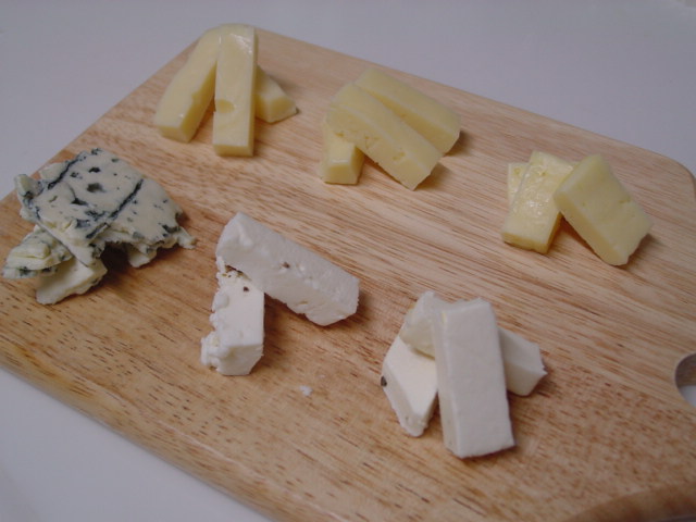 上の左から、半硬質で圧搾のサムソー、マリボー、ハヴァティ、下の左から、フランスのロック・フォールと同じ製法のリーズナブルなブルー、ダナ・ブルー、オレガノとオリーヴ・オイルをかけると美味しいギリシャのフェタ、そしてクリーム・チ−ズですが、こんな切り方をしてしまいました。