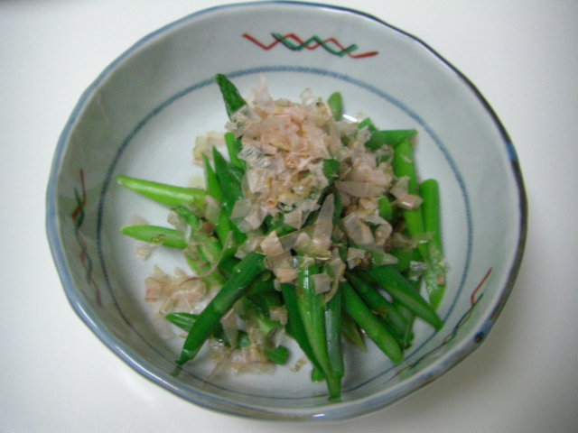 細めのグリーン・アスパラを茹でて、お醤油とかつをぶし削りをかけました。