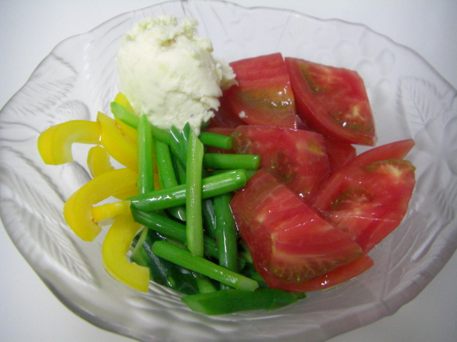そして、アスパラの茎の下の方とマッシュ・ポテトを載せたサラダ。