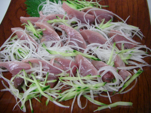 これは初かつを? 戻りかつをにしては、ちょっと早過ぎの感ですが、適度に脂が載っていて、私も美味しくいただきました。