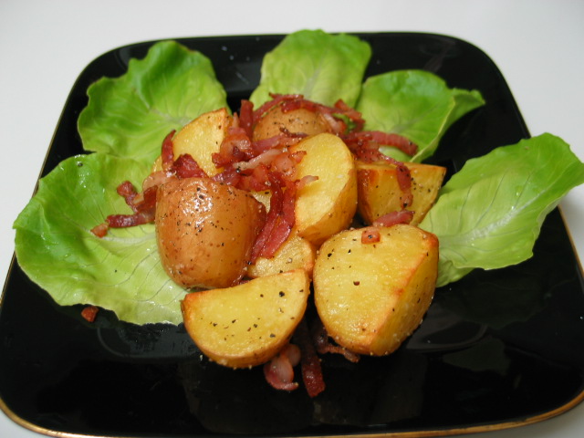 素揚げしたジャガイモに、カリカリに炒めたベーコンを加えて作る、じゃがじゃがベーコン。 ちょっと塩味が効いてるのが美味しいオーソドックスなジャガイモ料理。