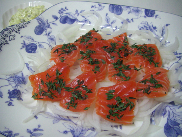 生食用のサーモンにお塩やお砂糖をふって、一日置いた、"〆サーモン"