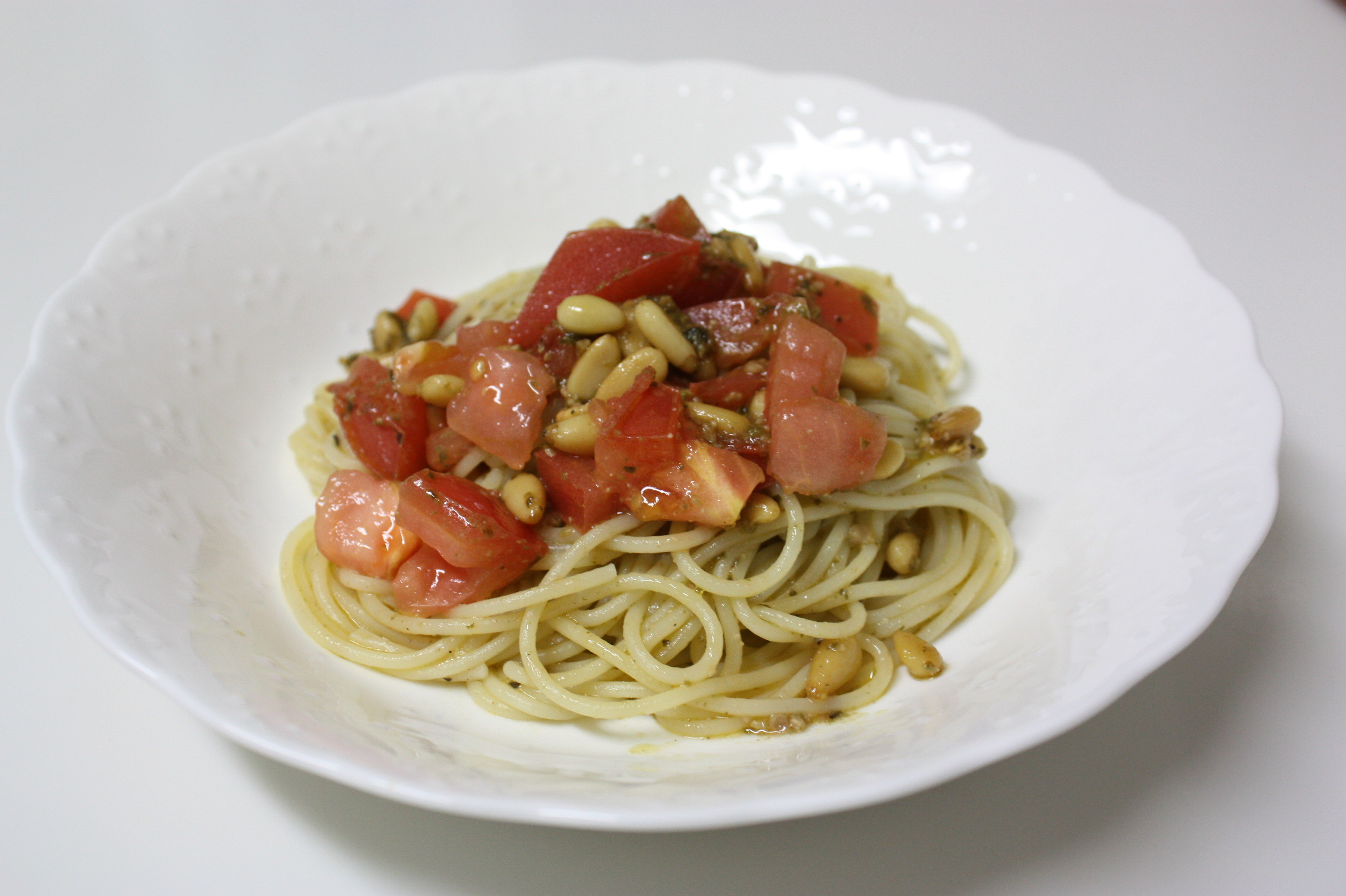 今日のパスタは、トマトと松の実のペスト・ジェノベーゼ。