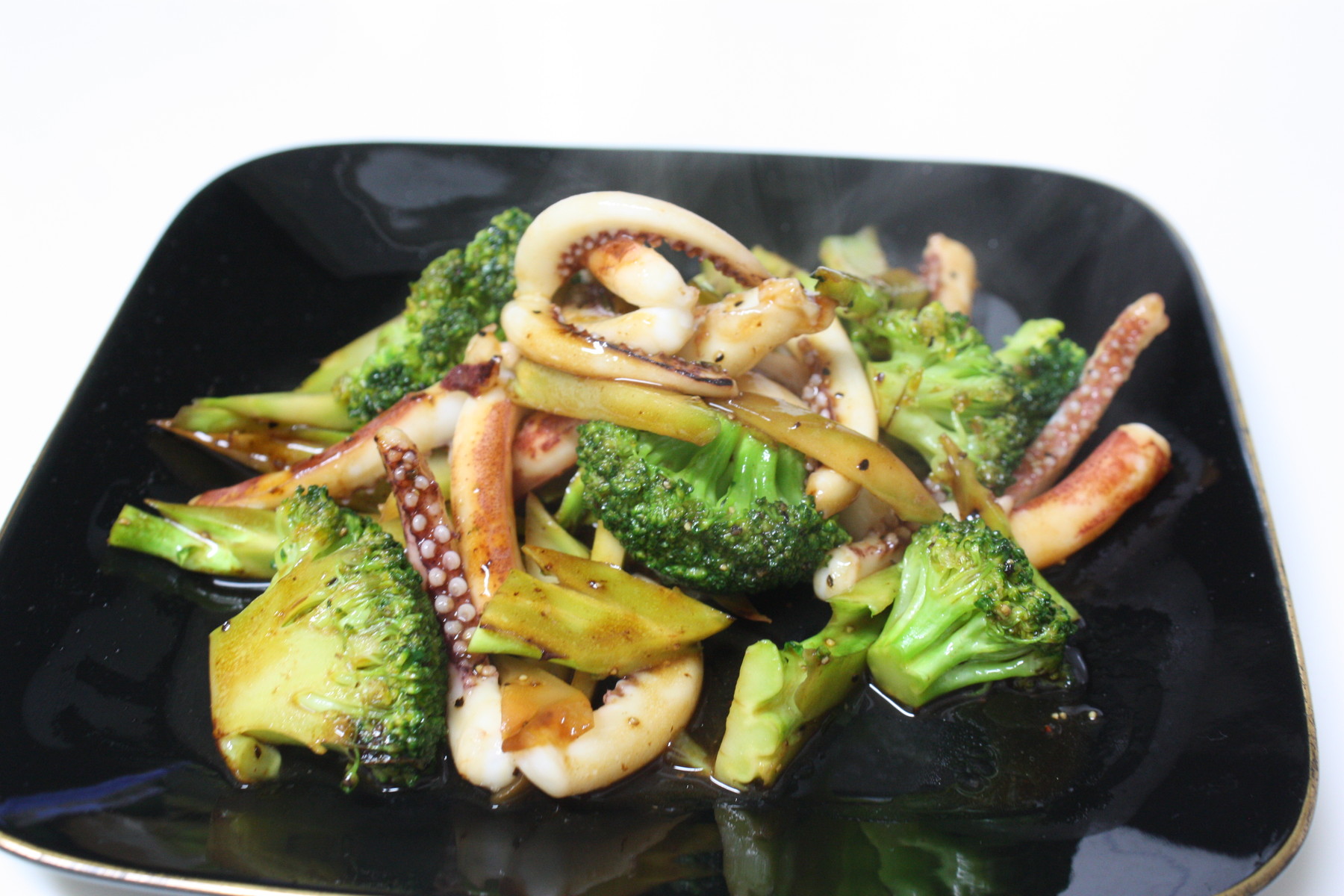 そこへお酒を少々。予めレンジしたブロッコリも入れて、お塩と胡椒をほんの少し。そして、オイスター・ソースを絡めたら出来上がり。