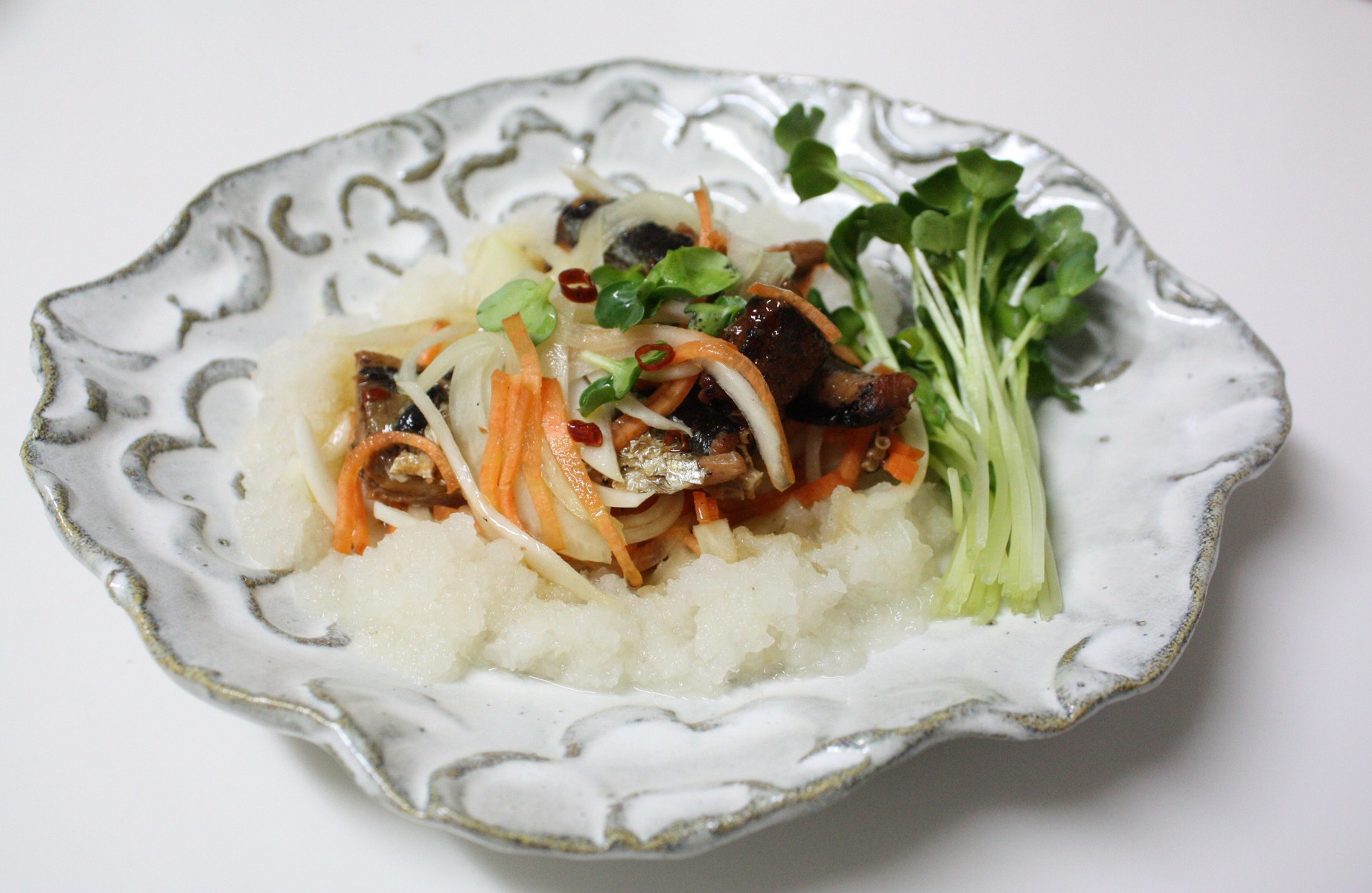 耐熱容器に、スライスした玉ねぎ、細切りの人参、さんまの缶詰を煮汁ごと入れて2分ほどレンジしたものを、大根おろしの上に載せて、柚子酢やお醤油、お出汁などをかければ出来上がりです。