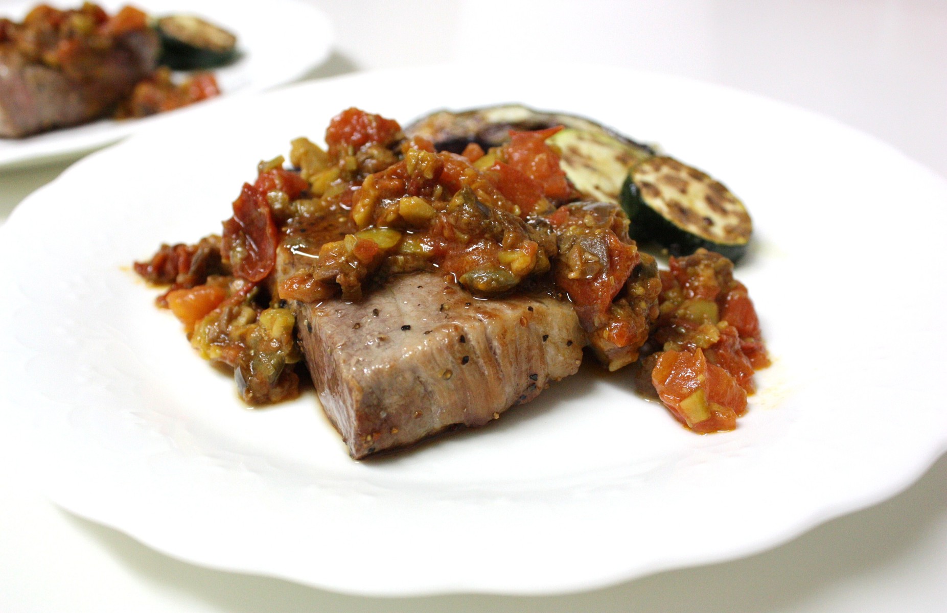 豚のロースに載せたソースは、パスタのソースで有名なプッタネスカ。