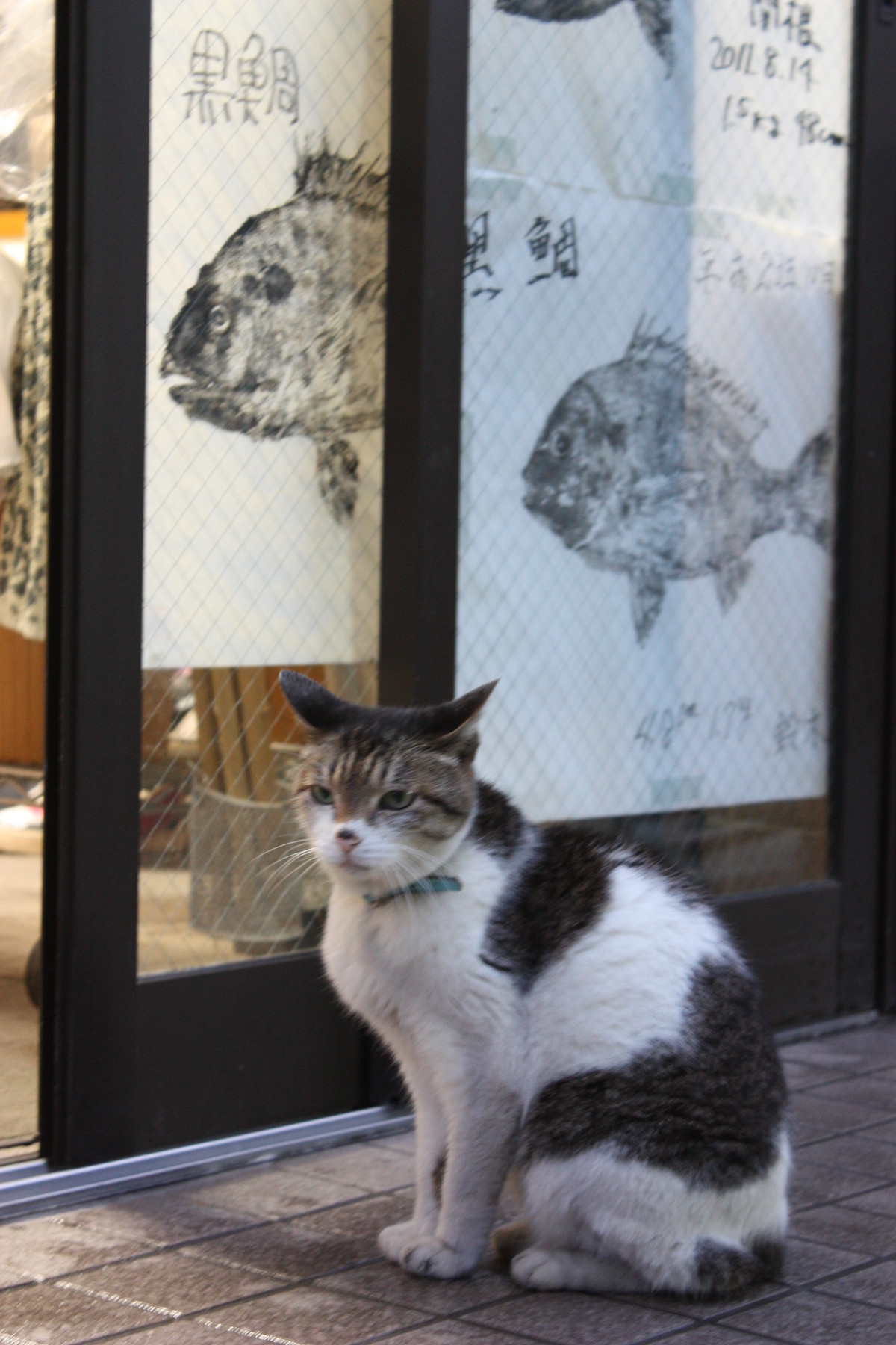 黒鯛の魚拓の前に座ったねこさん。