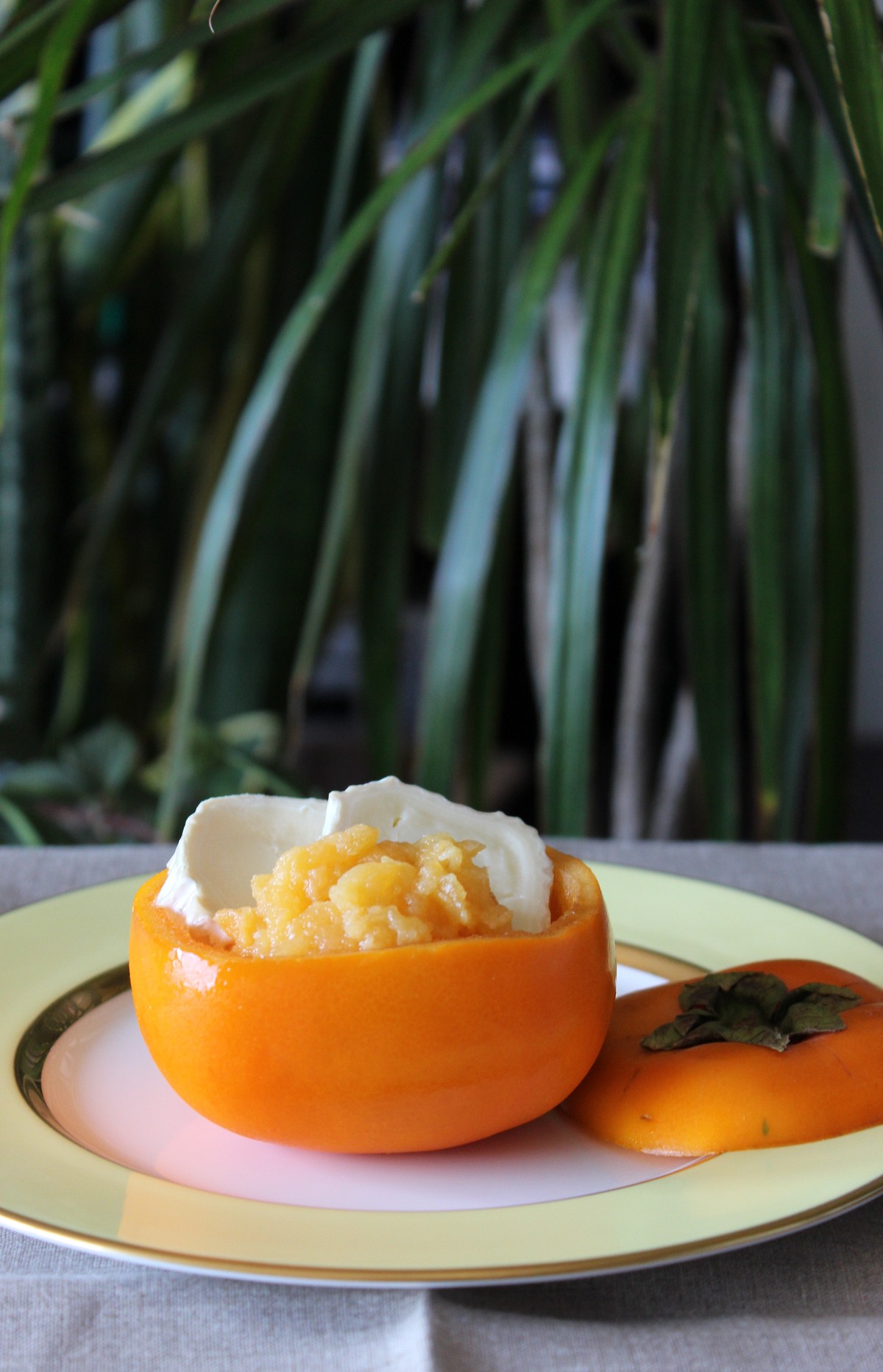 この前の 柿の白和え の柿のカップが可愛いかったので、中にゼラチンを混ぜた柿のコンポートを入れて固めた上にチーズとコンフィチュールを載せてデザート感覚のチーズ・カップを作りました〜。