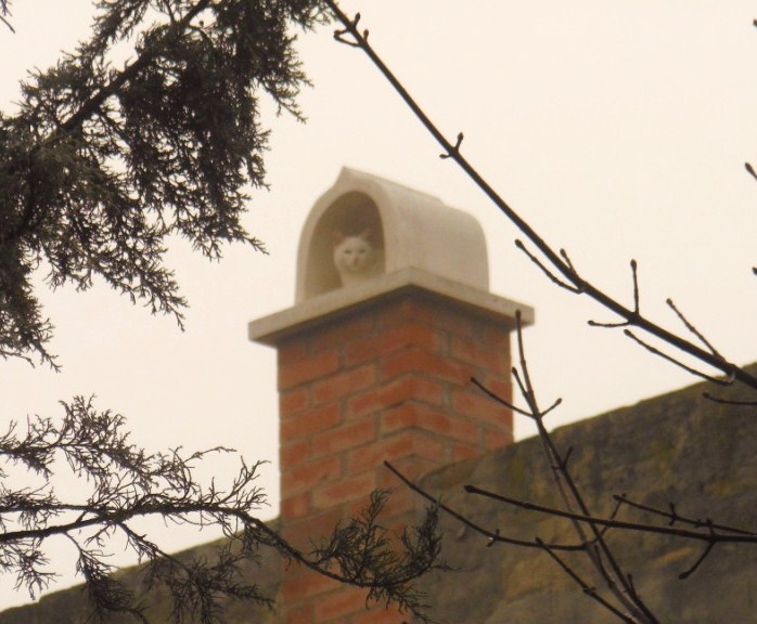 この猫さん、お友達の家のワンちゃんとよく追いかけっこをしているそうです。煙突の中、暖かいのかしらね〜?