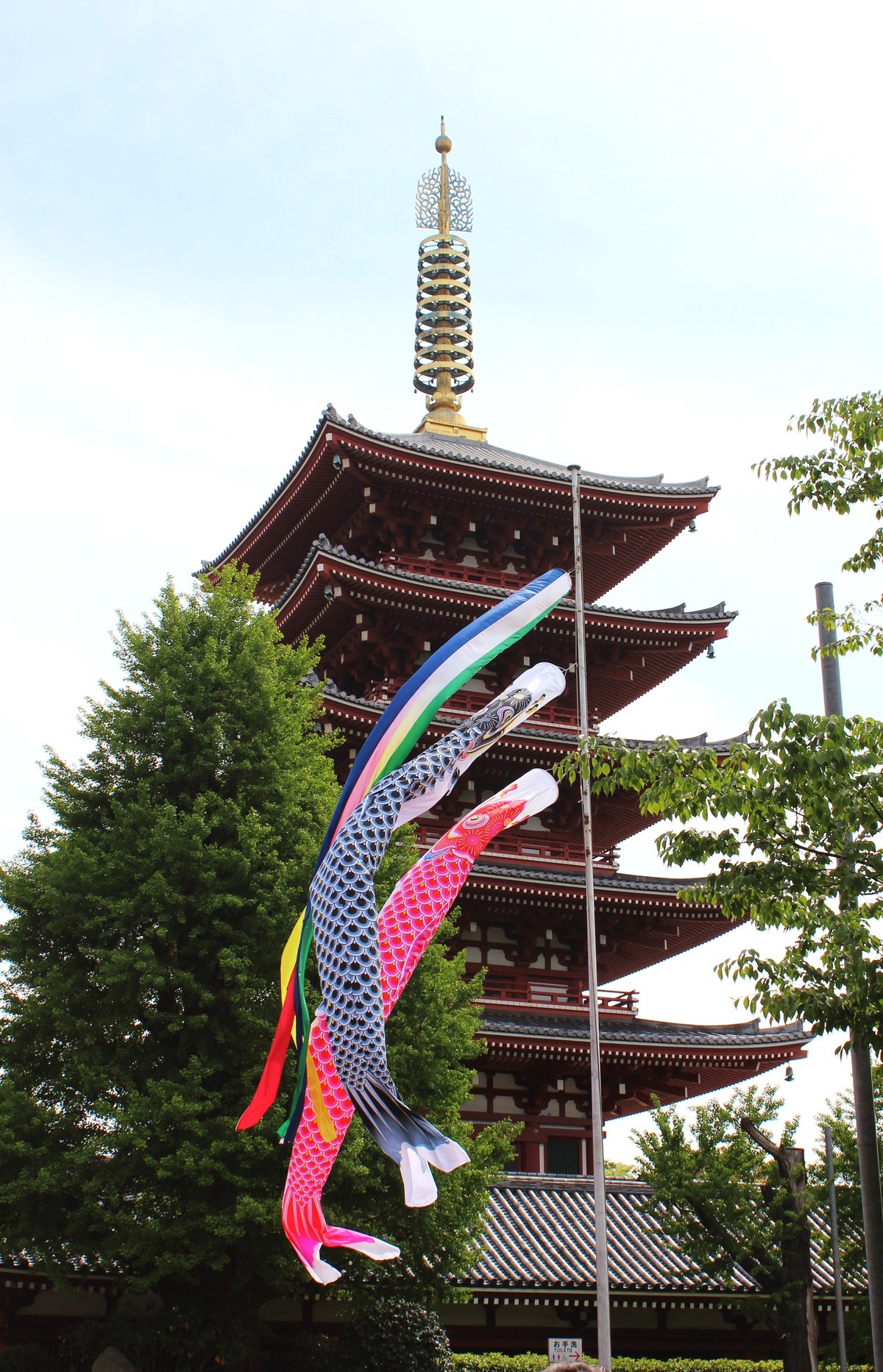 浅草寺の境内にある幼稚園児が仲見世通りをみんなで運んで揚げた鯉のぼりです。
