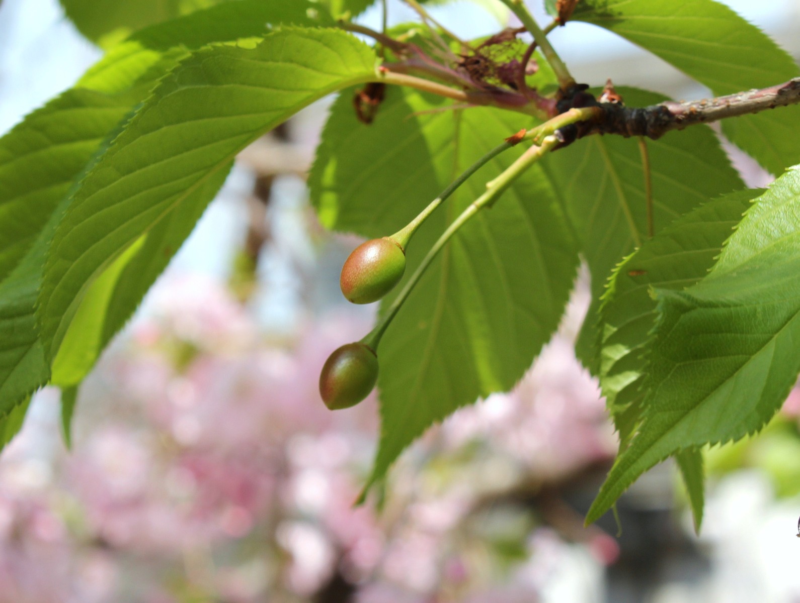 ↓ 枝垂れ桜の横にあった河津桜の木にはもうすでにサクランボ !!