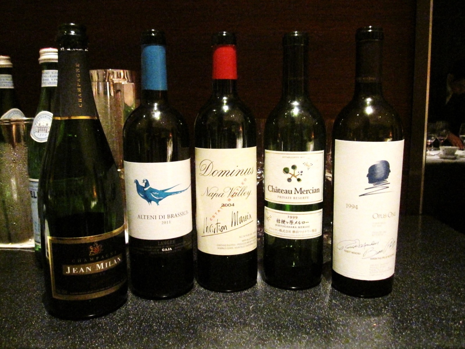 写真では赤の1本目と2本目のボトルの位置が逆です。桔梗ヶ原メルロー、ドミナス、オーパス・ワンの順番でいただきました