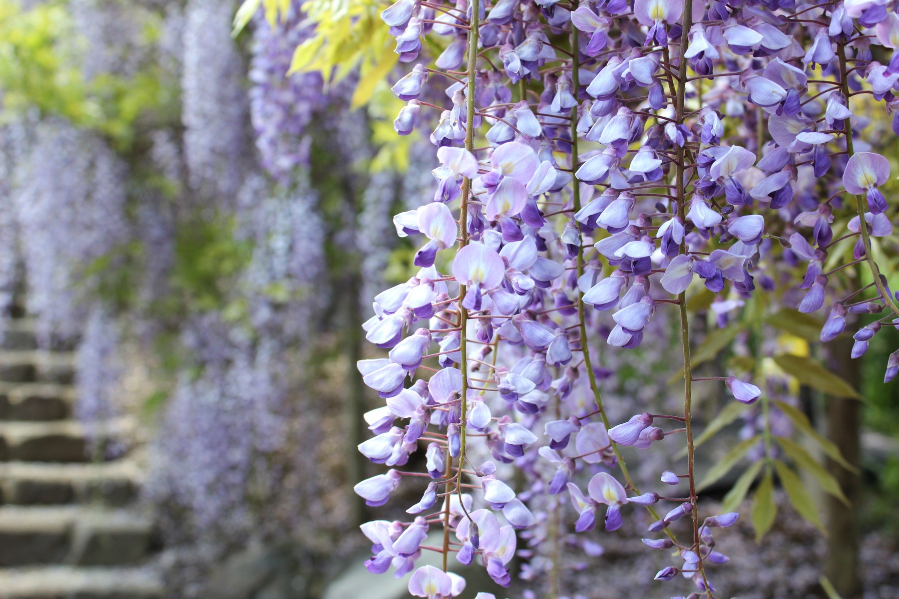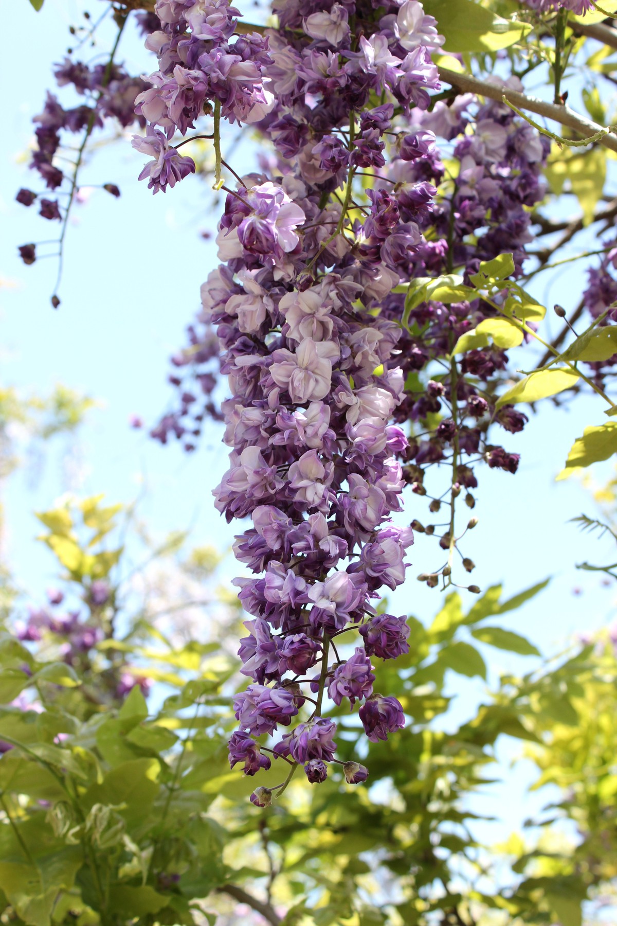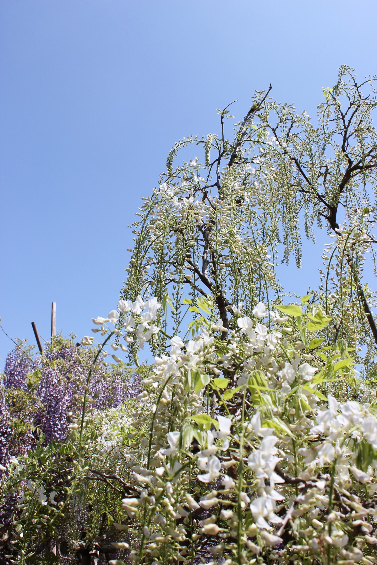 藤棚になっている場所もいくつかありますが、棚にしていない自然な藤がなんとも素晴らしく、木の間を歩いているとついフ〜ッと息を吸い込みたくなるほど良い香りが漂っています。蜂たちもブンブン