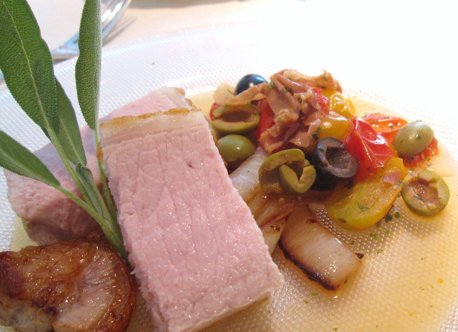 メイン:豚ロース肉のロティ 生ハムとオリーヴのソース