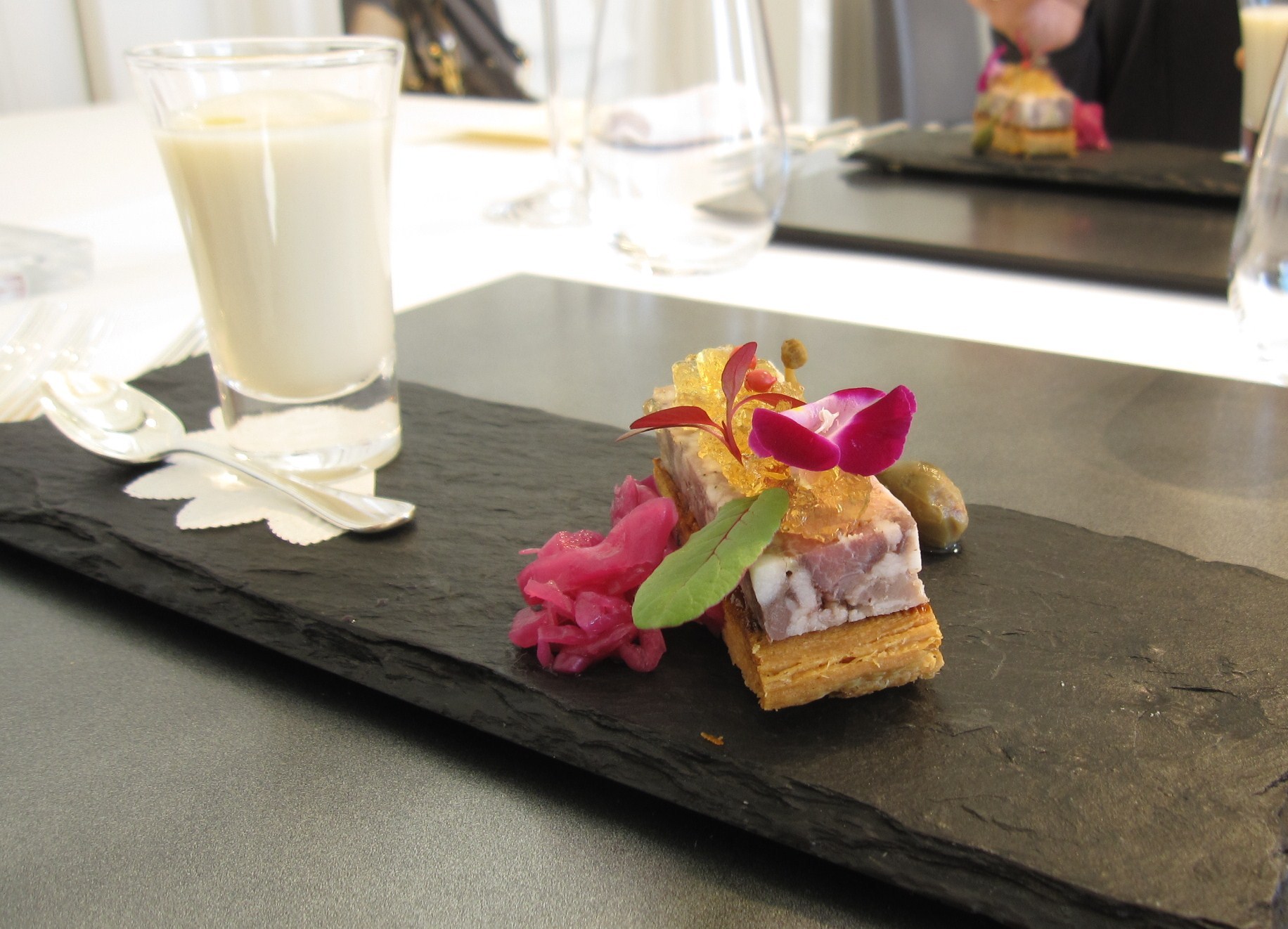 最初の前菜は、蕪の温かいポタージュと蝦夷鹿のパテがパイの上に載ったパテ・アンクルート。パテの上はコンソメのジュレです。ハーブやエディブル・フラワーが可愛く載っています。左側のピンクは、赤蕪の酢漬け。