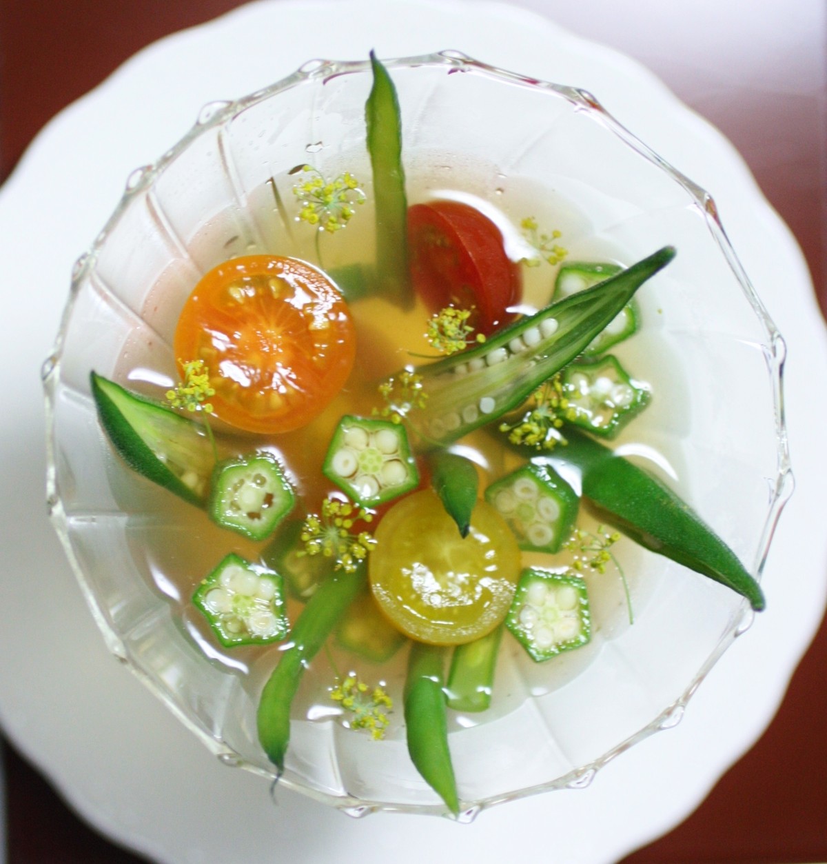 だいたい固まったスープの上に再び、お野菜を入れてフェンネルのお花を置いて、残しておいたコンソメ液を流し入れ、冷蔵庫へ。