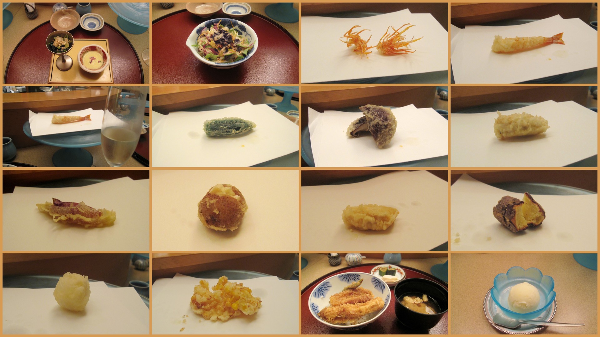 海老、京都の万願寺唐辛子、椎茸、鱧、茗荷、カマンベールを挟んだ新じゃが、雲丹、干した薩摩芋、うずらの卵、トウモロコシ。