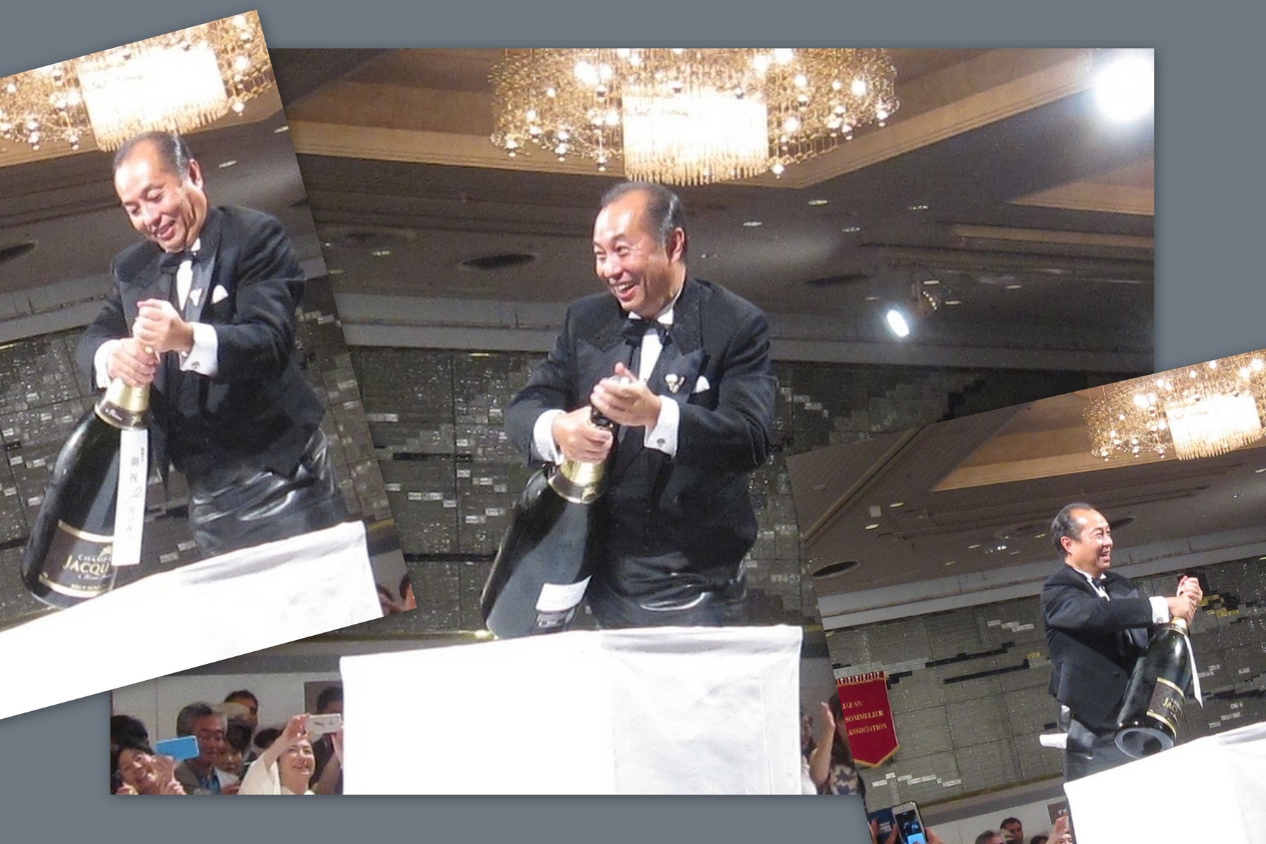 先生、大きなボトルを持ってご自分もクルクル回りながら、超ゴキゲン笑顔で、シャンパーニュの 12L (バルタザール) を抜栓。