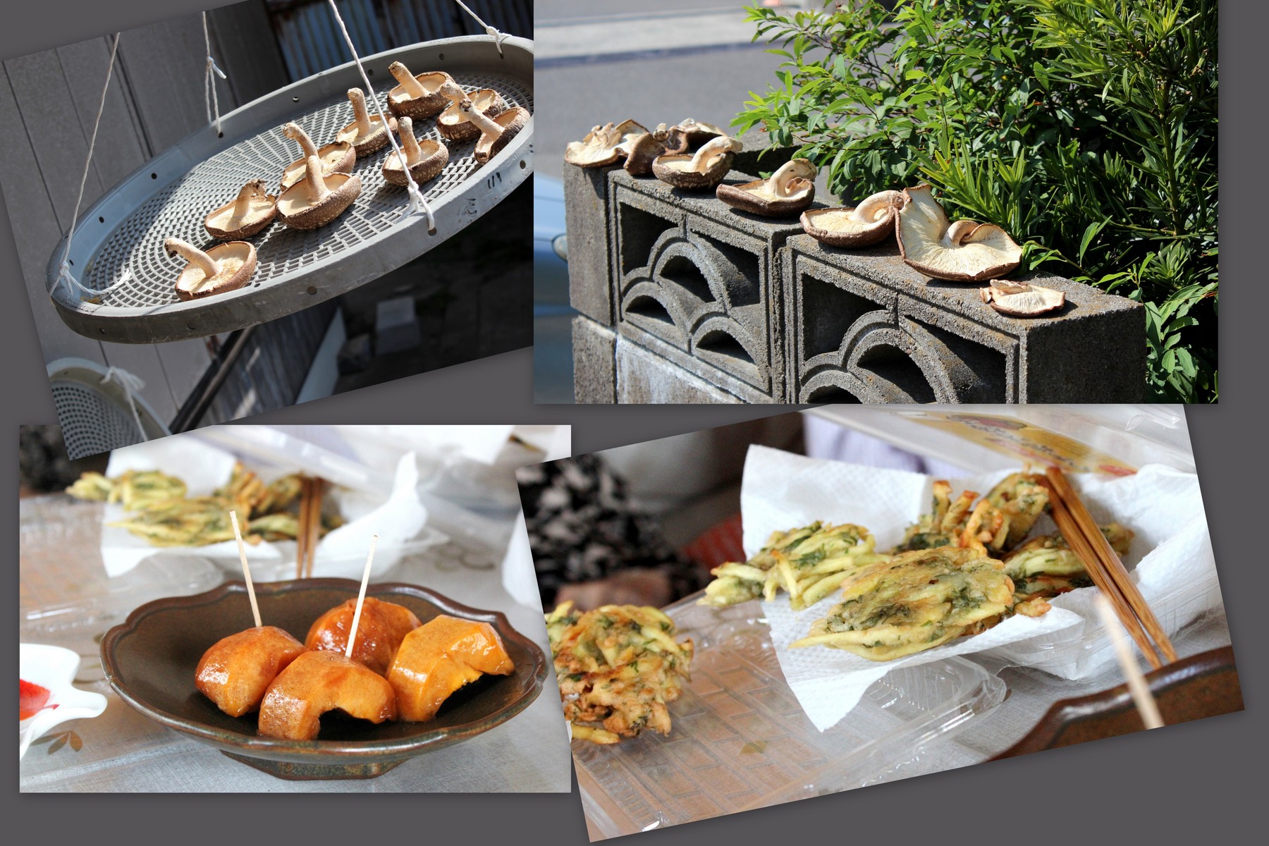 写真の右は、そんなご近所の方が持っていらした薩摩芋に人参の葉を混ぜて揚げてある、名前を思い出せませんが、おやつにもなる少し甘い揚げ物。