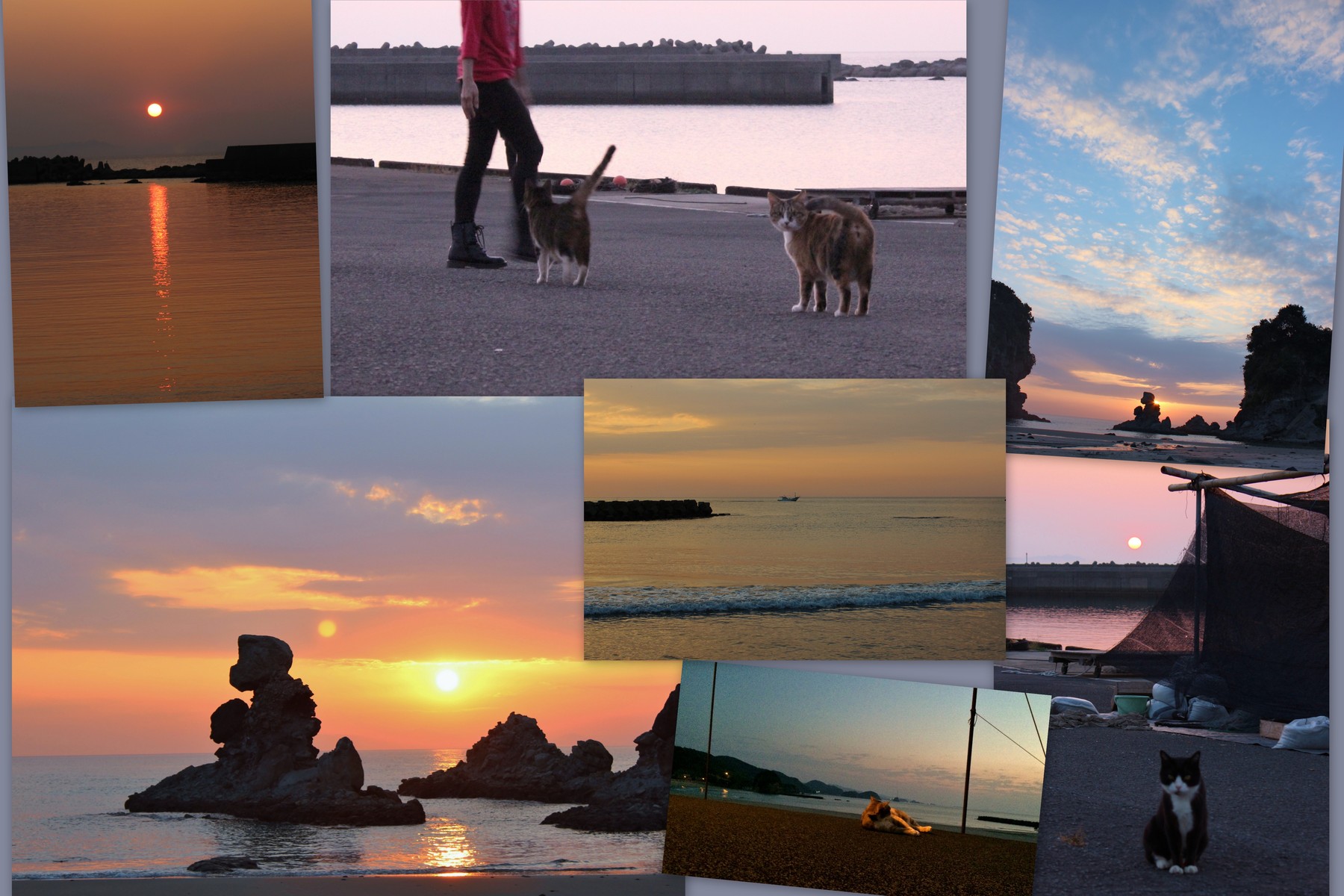 テーブルには、いろんなお菓子や果物がのり、お話も尽きず、今日もちっともお腰の上がらない父や Yおばさんを残して、私と従妹の Kちゃんは、夕日の人形岩を見に。 戻ったら猫たちが防波堤で遊んでいました。