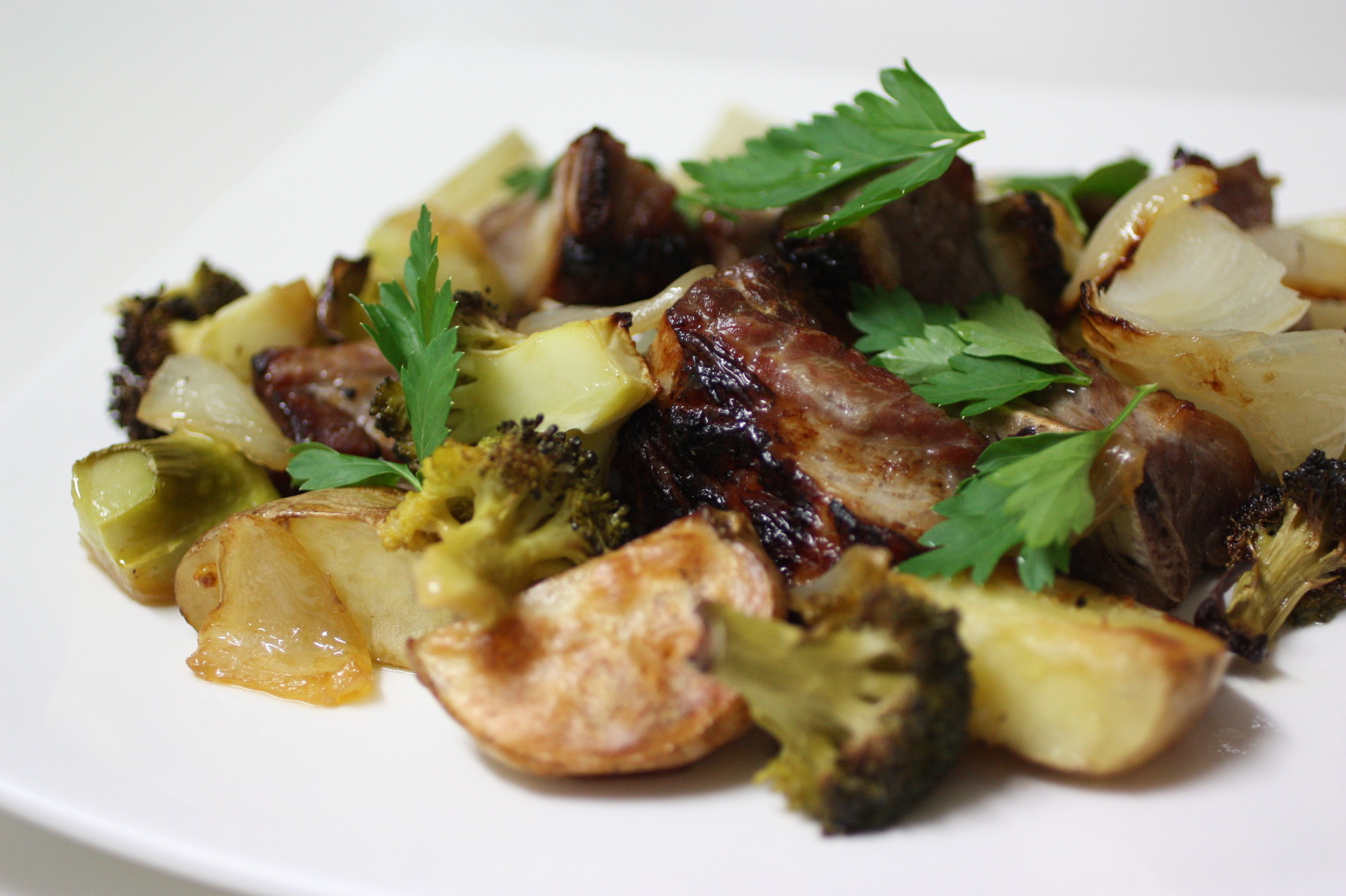 耐熱皿に適当なお野菜も一緒に置いて、途中ひっくり返しながら 210℃のオーヴンで 30分焼きました。