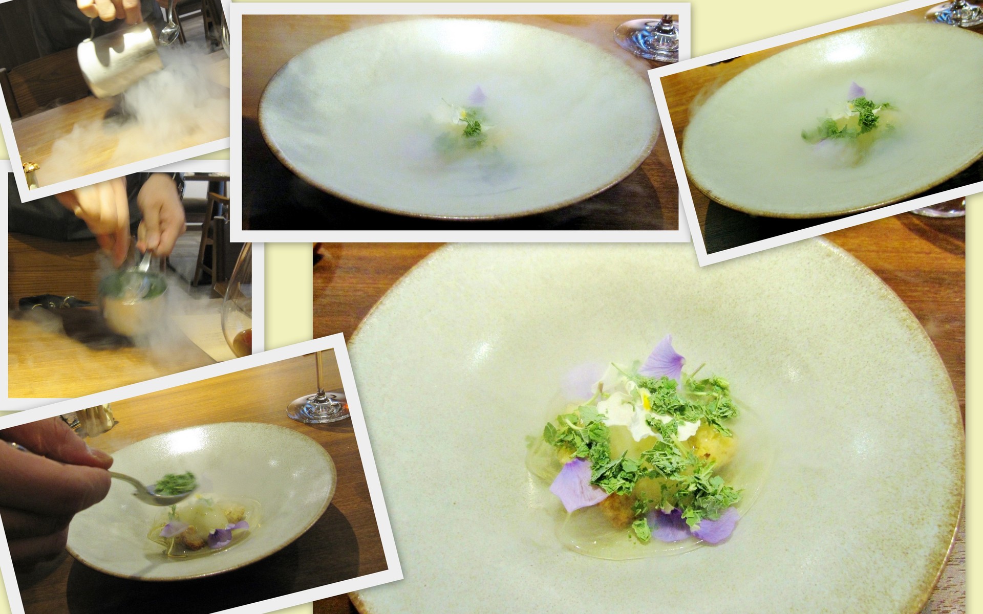 液体窒素で冷凍して崩したハーブを載せたら、冷気がふわぁ〜、お皿の中が隠れました。 冷気が飛んで現れたデザートの彩りの綺麗なこと。