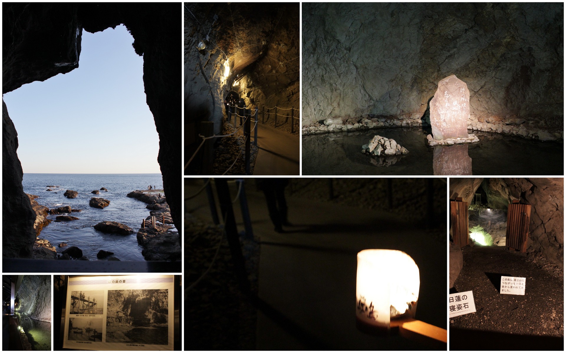 中は第一岩屋と第二岩屋に分かれていて、第一岩屋では手燭(ろうそく) の明かりを頼りに進みます。その第一岩屋の奥は富士に通ずるとか・・・。(写真、右下)