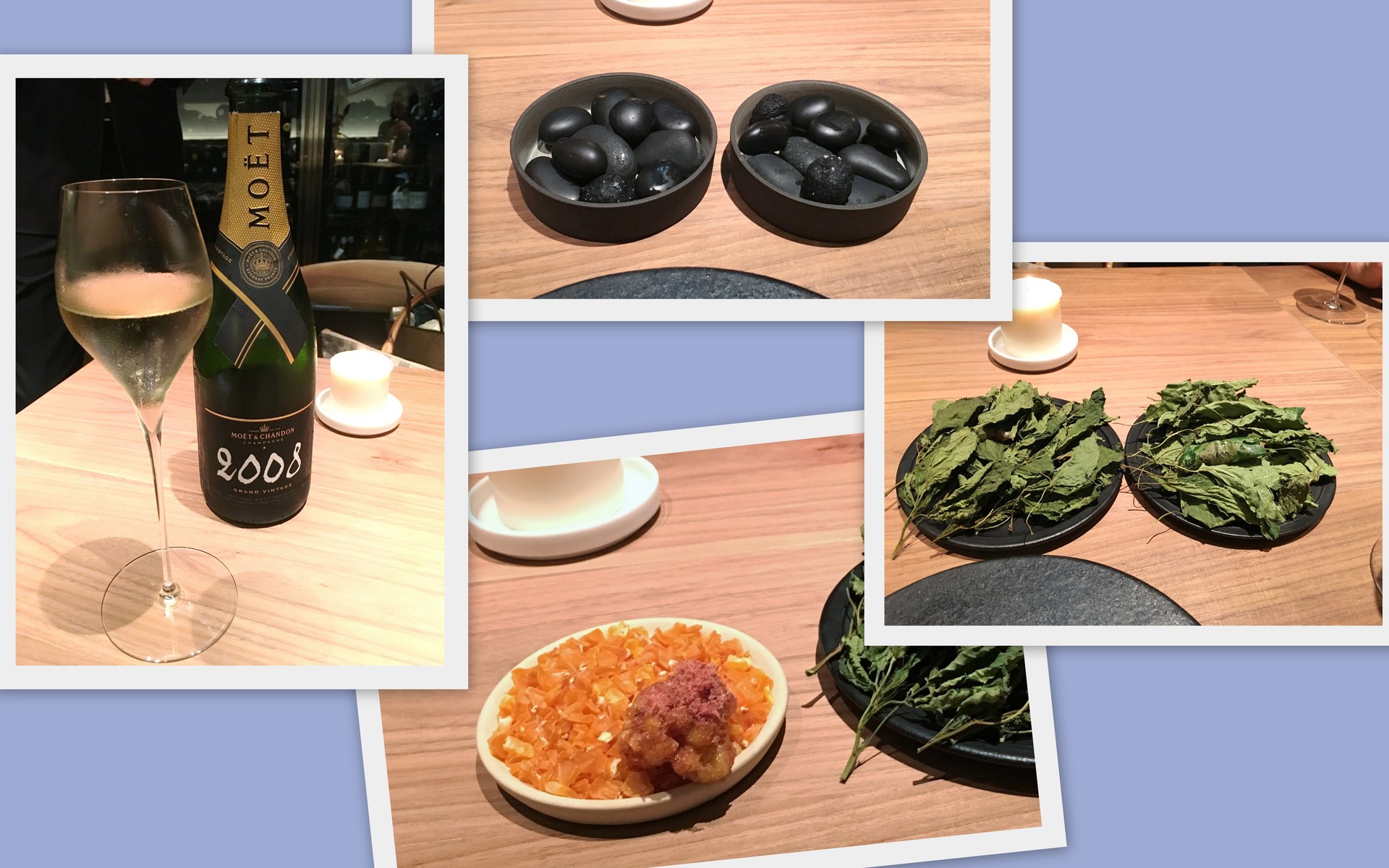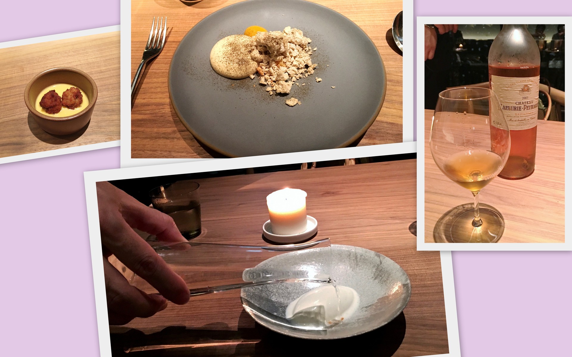 左下の透明なのは発酵させたトマト・ウォーターとカモミールのオイル。カモミールの香りが心地良い。右のオレンジ色のは、多分人参の粉で作ってあり、中にはさっきまでピチピチしていたという車海老とトロンとしたクリーム状のもの・・・人参由来かな〜・・・が入っていました。ちゃんと説明を受けたのに、すっかり記憶の彼方。