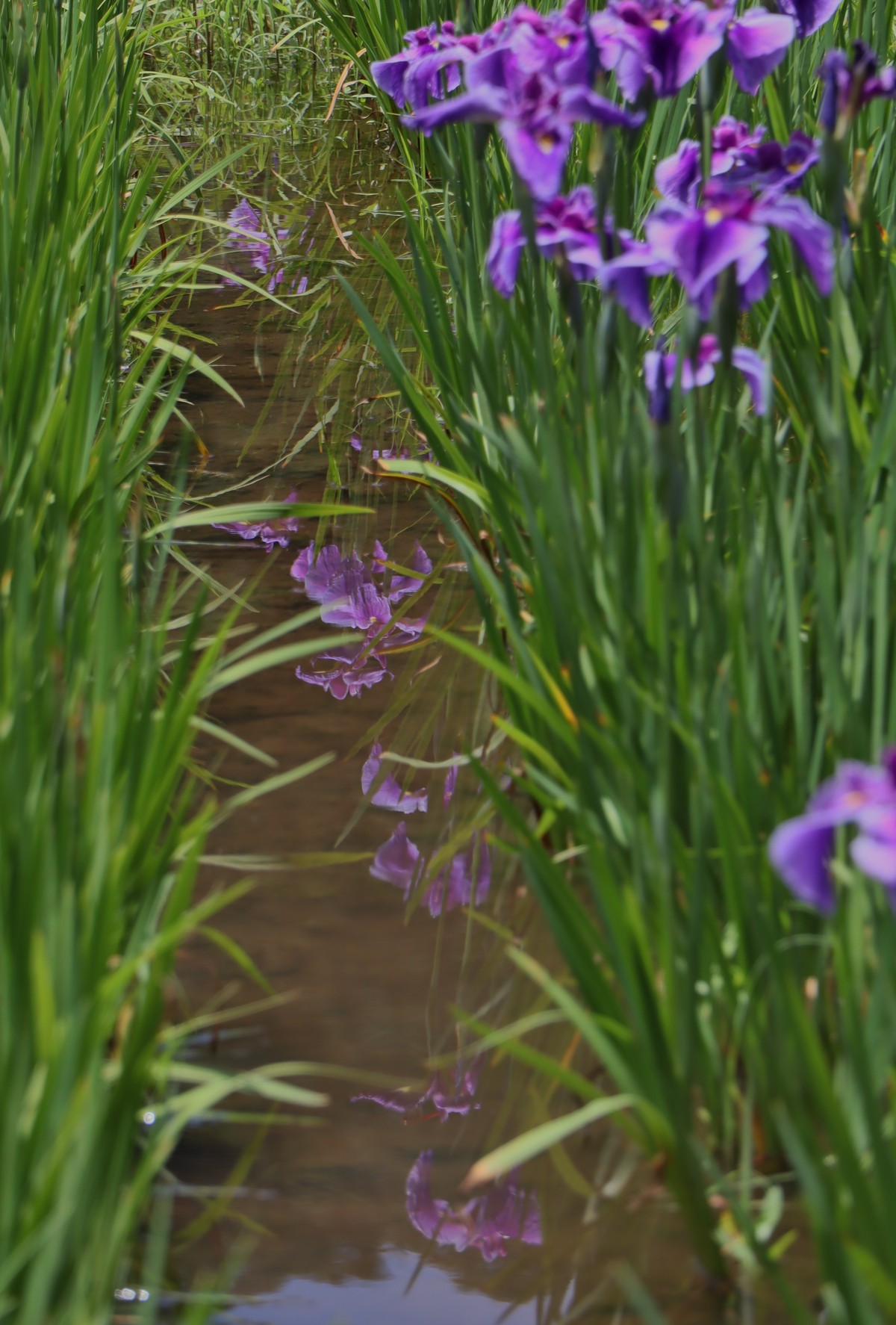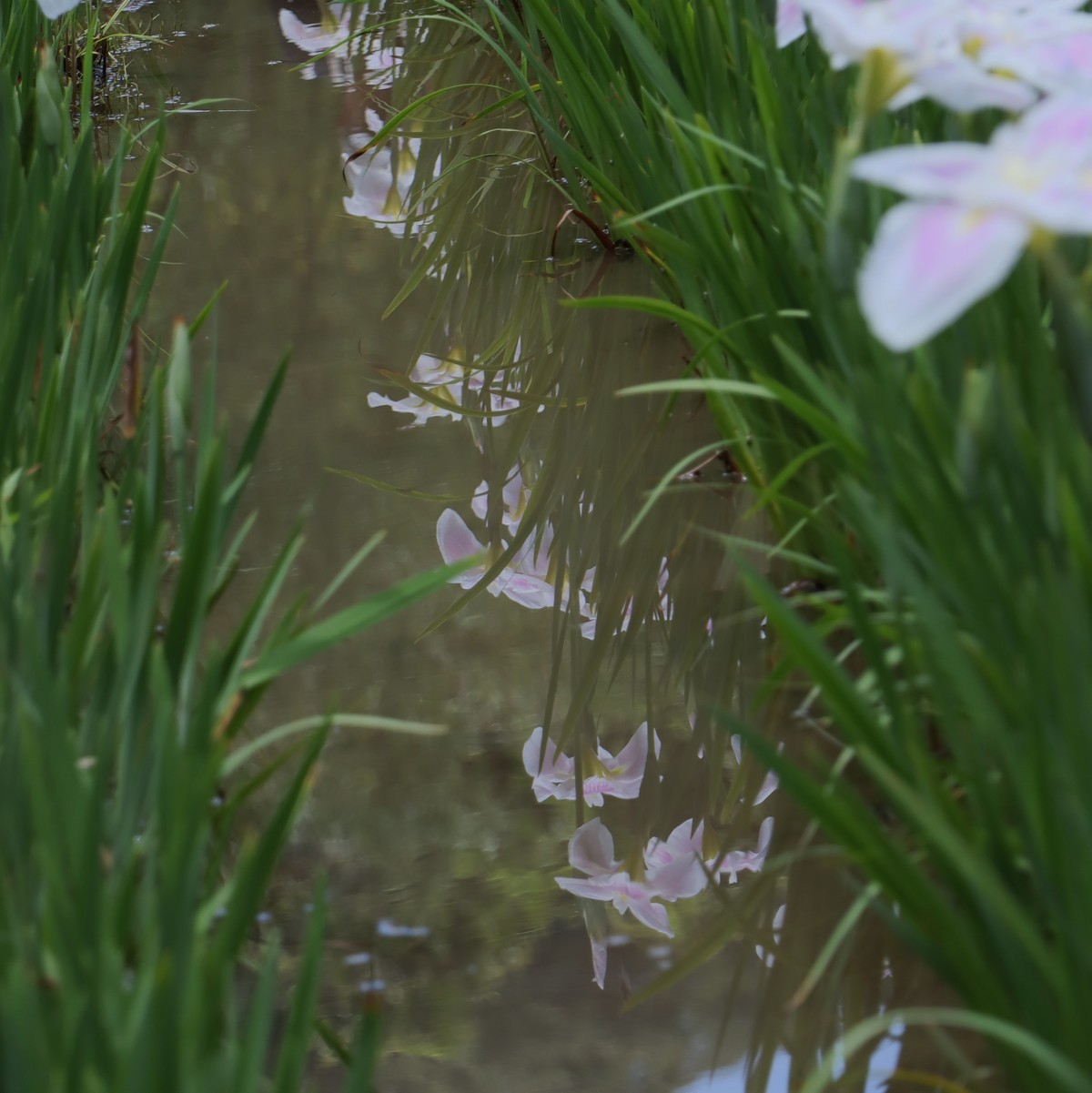 水面の木々と花菖蒲