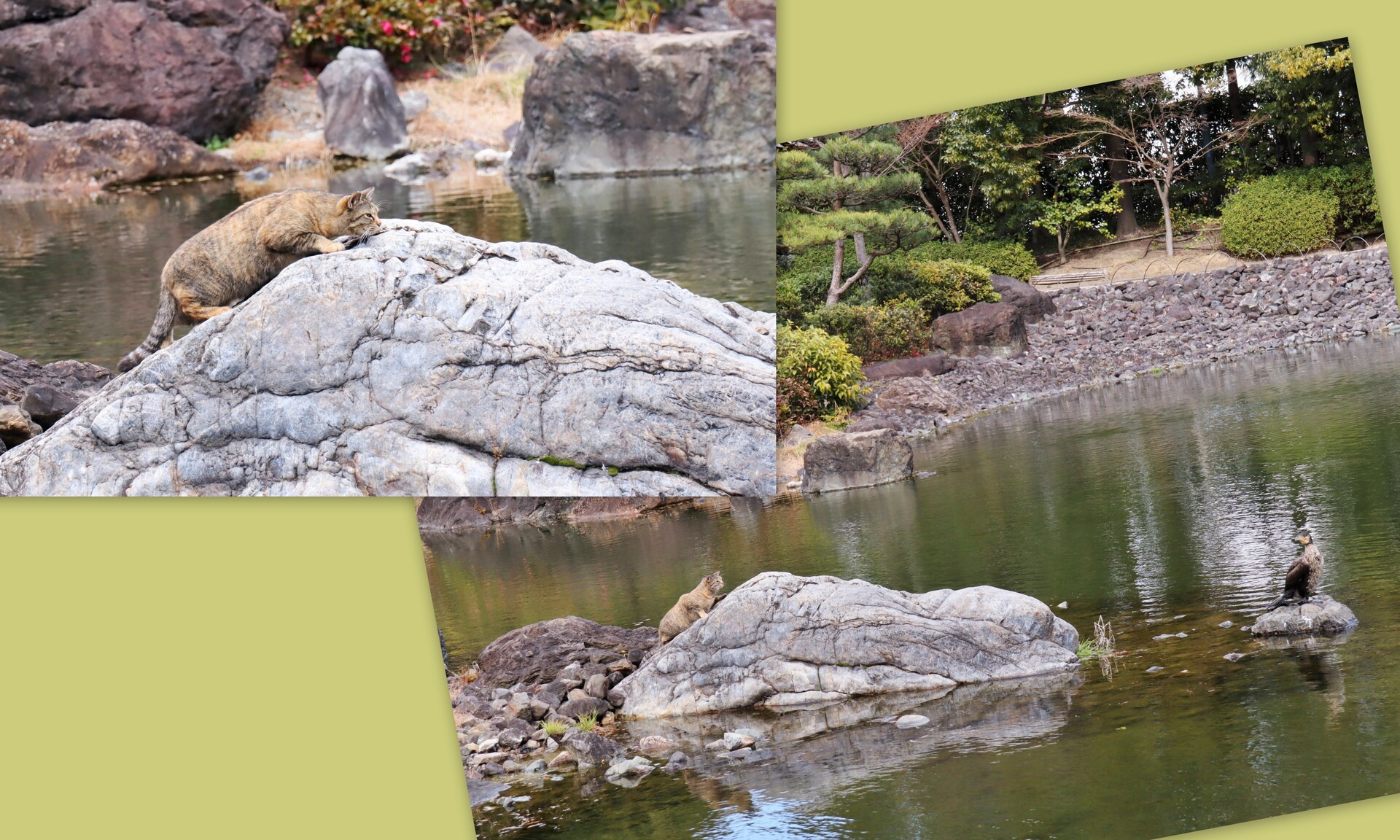 ニャーちゃんは、池でお魚を待っている鵜を狙っていました。