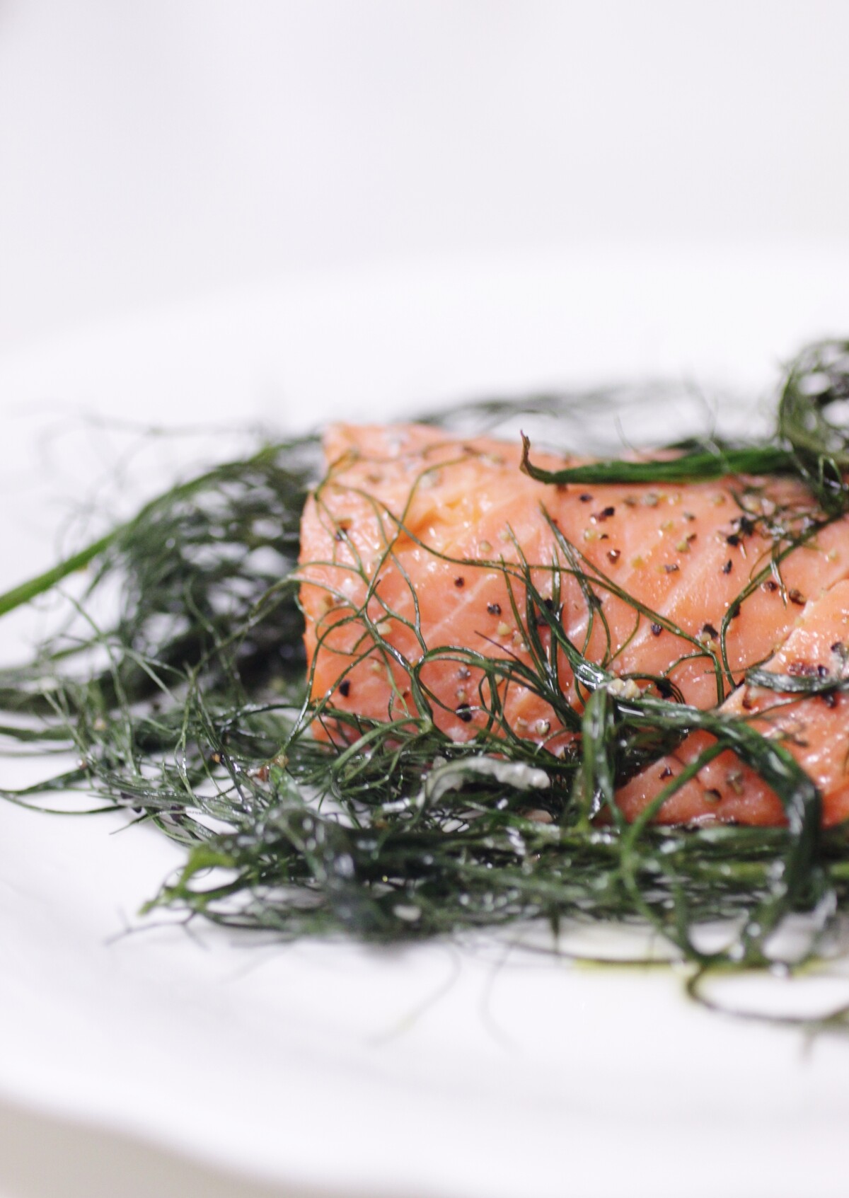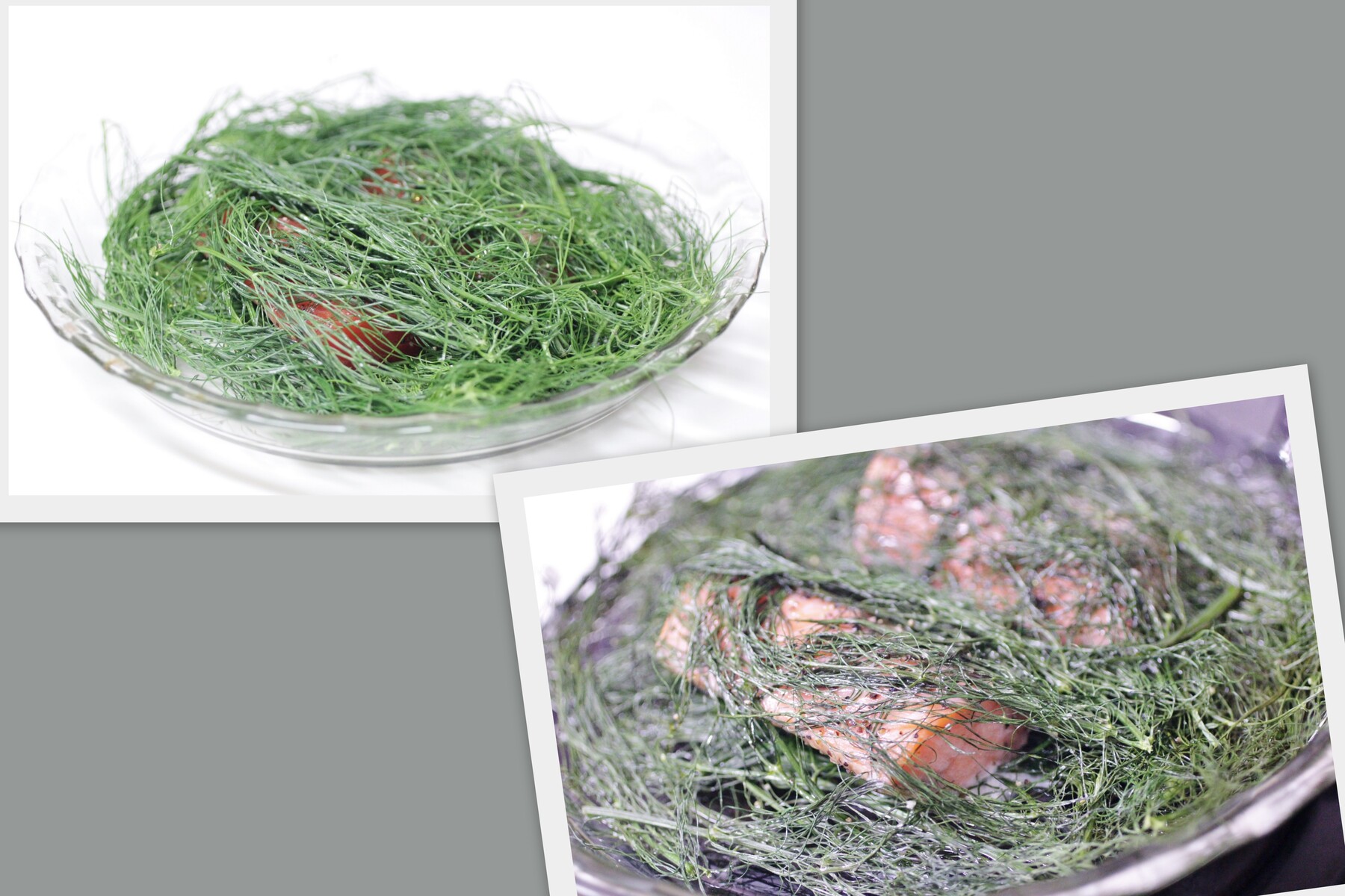 生食用のサーモンに塩・胡椒してフェンネルの葉の中へ。