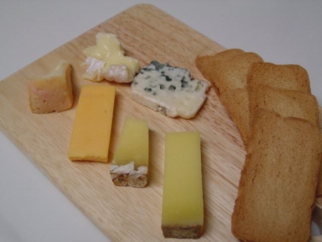 チーズいろいろ。向かって左の上から、潮風を受けた牧草で育った牛から作るカマンベール・ド・ノルマンディ、3大ブルーチーズの一つ洞窟で熟成させるロック・フォール、左の上から、軽めのウォッシュ・チーズ、マンステール・ジェロメ、チェダー80%のプロセス・チーズ、素朴な塩味のカンタル、そしてほこほこして栗っぽい香りのコンテ1年熟成。