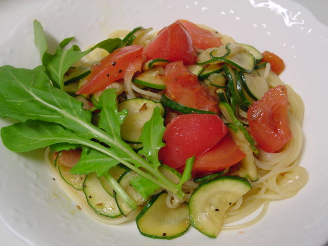 今夜はアーリオ・オーリオでズッキーニとトマトのパスタにしました。