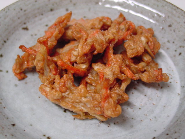 春らしい色と名前の桜えびは絹さやと一緒にかき揚げにしてみました。