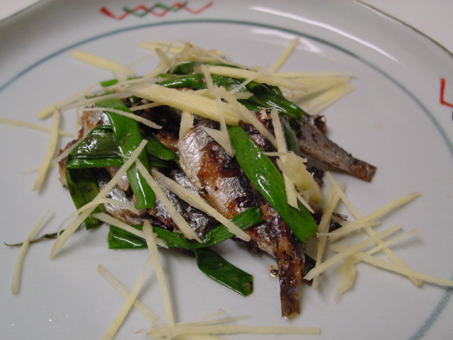 オイルサーディンをお醤油とお酒で和風に味付けして、お葱と細切りの生姜を薬味にしてみました。お酒の肴にぴったりの一品。