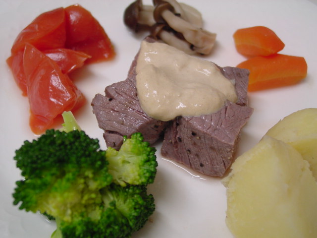 今日のメインは、牛肉のホース・ラディッシュ・ソース。ブイヨンで煮たお野菜を添えています。牛肉も塩・胡椒した後同じブイヨンでさっと茹でます。ホース・ラディッシュの味が牛肉に良くマッチして、結構お腹がいっぱいだったのにペロリと食べてしまいました。