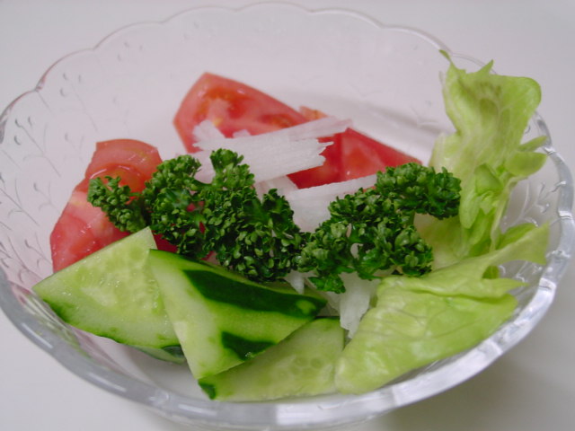 今日のサラダのドレッシングは、フレンチ・ドレッシングにマスタードを加えています。辛味と同時に香りも楽しめます。