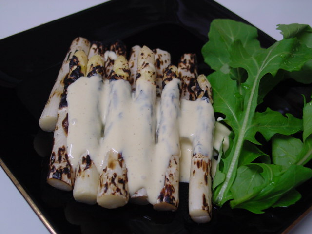 白アスパラのマヨネーズ・ソース。ガスで焼くので、なかなか綺麗には焼けませんが、白アルパラはこうして食べるのが一番です。ソースはマヨネーズにディジョン・マスタードを入れほんの少しのミルクとレモン汁で延ばしました。